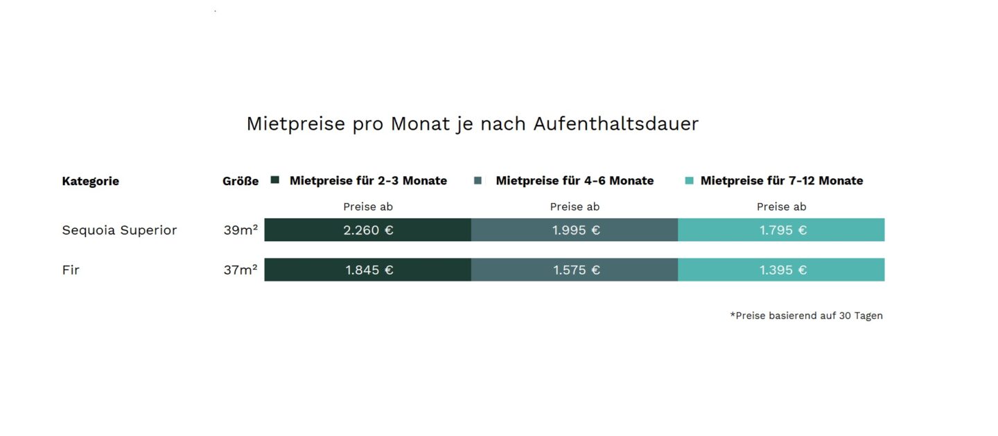 *Die dargestellten Mietpreise sind Warmmieten. Je nach Aufenthaltsdauer und Objekt findet eine individuelle Verbrauchskostenabrechnung statt. Für mehr Informationen bitte hier klicken.