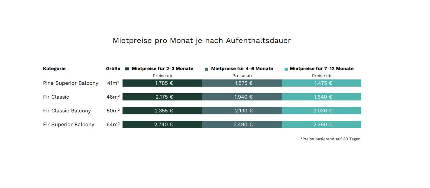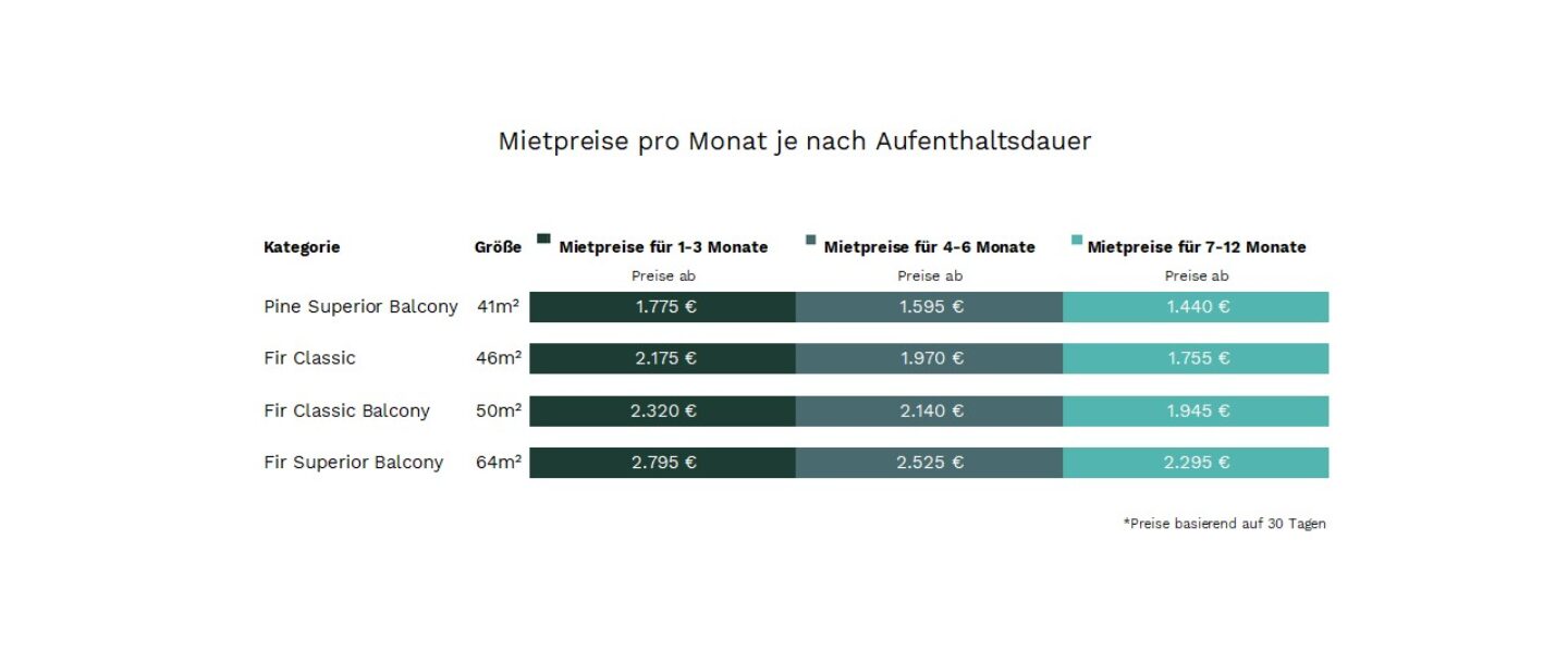 *Die dargestellten Mietpreise sind Warmmieten. Je nach Aufenthaltsdauer und Objekt findet eine individuelle Verbrauchskostenabrechnung statt. Für mehr Informationen bitte hier klicken.