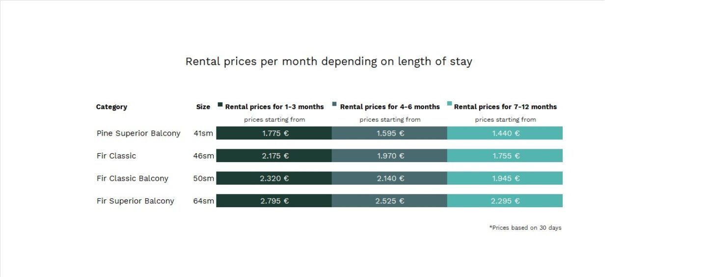 Starting at Rent per Month 1440,-€*Our Pine Superior Balcony - 41 square meters of space, designed for your needs. Fully furnished & equipped with a double bed, urban designed living area with open kitchen and a modern bathroom with bathtub and many other special amenities.